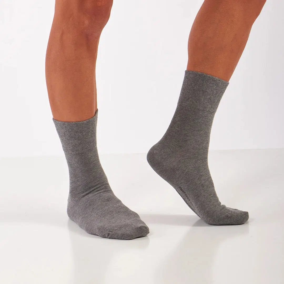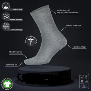 Our organic cotton socks for diabetics are constructed for maximum circulation without falling down. Non-binding with extra stretch in the legs. No-feel toe seam and plush cushion foot.